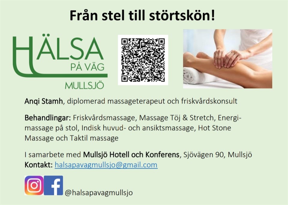 Mullsjö IF kan nu erbjuda alla medlemmar att få rabatterade massagebehandlingar via Hälsa på väg Mullsjö. Hälsa på väg Mullsjö håller till vid Hotel Mullsjö och där får alla spelare, ledare och övriga medlemmar i föreningen 10 % rabatt på alla massagebehandlingar. Behandlingar - Friskvårdsmassage - Massage Töj & Stretch - Energimassage på stol - Indisk huvud- och ansiktsmassage - Hot Stone Massage - Taktil massage. Kontakt halsapavagmullsjo@gmail.com Varmt välkommen! Anqi Stamh, diplomerad massageterapeut och friskvårdskonsult