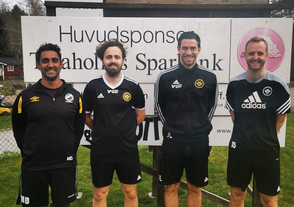 Året 2021 är lika svårt att spekulera i som 2020 var att summera. Trots det går vi in med höga förhoppningar på 2021. Vi har en blandad trupp med några spännande yngre förmågor som får ta klivet upp blandat med äldre rutinerade herrar. Utöver de juniorer som tagit klivet upp har vi förstärkt truppen med ytterligare 3 spelare. Jonas Karlsson som har ett förflutet i Sandhem, med Jonas får vi en duktig tvåvägsspelare som kommer tillföra kvalité. Mattias Karlsson har jobbat utomlands de senaste åren och inte spelat, men har innan sin utlandsvistelse spelat i division 3 och 4 i Vänersborg. I Mattias får vi en riktig ledare som kommer tillföra mycket för de unga grabbarna och ge oss en trygghet i spelet. Pierre Lööv har spelat i Bottnaryd, han kommer bidra med mycket djupledshot. Om vi får behålla alla spelare och hålla oss ifrån allt för mycket skador så går vi in med känslan av att vi ska vara ett lag som hamnar på den övre halvan när serien summeras till hösten. Vi i tränartrion (Jimmy, Jonas, Jakob) försöker implementera och jobba vidare med det spelsystem vi började med förra säsongen. Vi har tyvärr haft dålig uppslutning under försäsongen, vilket gjort att vi inte riktigt kommit så långt som vi önskat. Trots det känns det som att alla vet vad som krävs och förväntas av dem. Nu kan vi bara hoppas att vi får spela en full säsong och att vi återigen framåt hösten kan få ha lite publik på matcherna. Herrarnas ledarstab 2021 är det från vänster: Mathias Davidsson - Lagledare. Jakob Helander - Assisterande tränare. Jimmy Lindberg - Huvudtränare. Jonas Bergvad - Assisterande tränare. Foto: Peter Karlsson