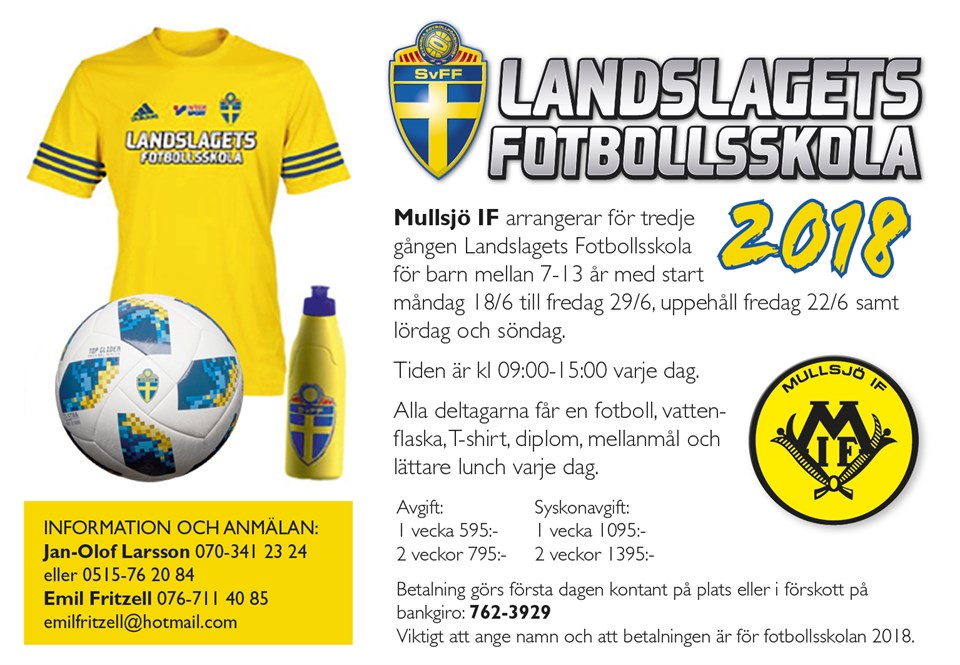 Om bara tre veckor börjar årets fotbollsskola på Gruveredsvallen. Anmälan har varit öppen några veckor och anmälningarna har trillat in ordentligt vilket är mycket roligt. Om du vill anmäla ditt barn till sommarens fotbollsskola behöver vi veta följande infomration nedan. Namn: Hela personnumret tio siffror: Antal veckor en eller två? Allergi av något slag? Får barnet vara med på bild och med namn i tidningen, på hemsidan samt sociala medier? Spelar barnet fotboll i ett av Mullsjö IF:s ungdomslag? Om nej, i vilken förening i så fall? Telefonnummer till förälder eller vårdnadshavare: Kontakta Emil Fritzell eller Jan-Olof Larsson för anmälan, kontaktuppgifter finns på bilden ovan.