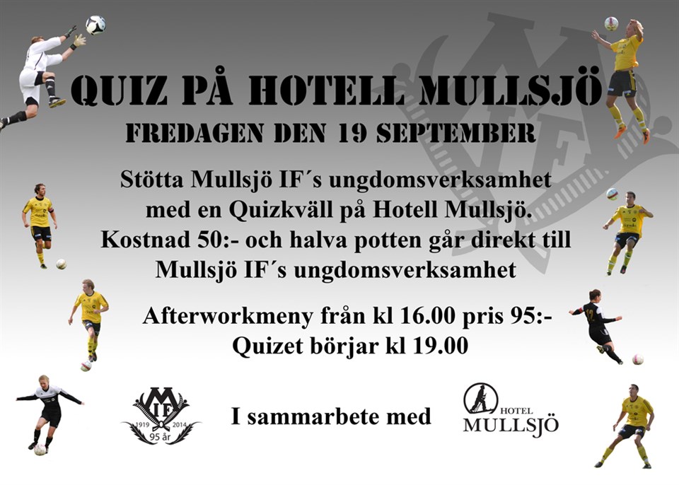 Mullsjömilen går nu av stapeln för 6:e året i rad! Denna gång står Mullsjö IF som arrangör. Lördagen den 4 oktober går startskottet. Var du med 2009, 2010, 2011, 2012 eller 2013, hört talas om det, eller är det helt nytt för dig? Mullsjömilen är en vandring på ca 1 mil, med start/mål på Gruvered. Första starten är 10:00, därefter startar lagen med några minuters intervall. 3,5 timmar efter sista starten stänger sekretariatet. Karta och startkort delas ut i samband med er starttid. Utmed banan ska deltagarna, med sina respektive lag (4-7 deltagare i varje), lösa roliga klurigheter på sex stationer samt visa sina kunskaper i en tipspromenad för både vuxna och barn. På köpet får alla en dag i naturen tillsammans med vänner, familj och kollegor, eller vilka man nu väljer att bilda lag med. Många har picknickkorgar med sig, andra köper fika/mat utmed vägen. Alla åldrar kan delta, barnvagnar och mountainbikes funkar och många går med sina hundar. Vi har inte sett lag till häst ännu. Alla är välkomna! Priser delas ut till de fyra bäst placerade lagen samt ett antal utlottningsvinster. Därutöver får några lag pris för bästa namn och/eller bästa prestation. Dessa utses av sekretariatet. Vi hoppas på att få se många medlemmar från MIF samt andra gäster från när och fjärran i skogarna. Kostnad för att delta är 500 kronor per lag. I detta ingår fri entré till Mullsjö IF´s hemmamatch söndagen den 5 oktober klockan 15:00 mot Ölmstads IF. Betalning sker i förskott till Mullsjö IFs bankgironummer 762-3929 (märk betalningen med ert lagnamn), alternativt kontant i samband med start. Anmälan görs i menyn till vänster Mullsjömilen anmälning.