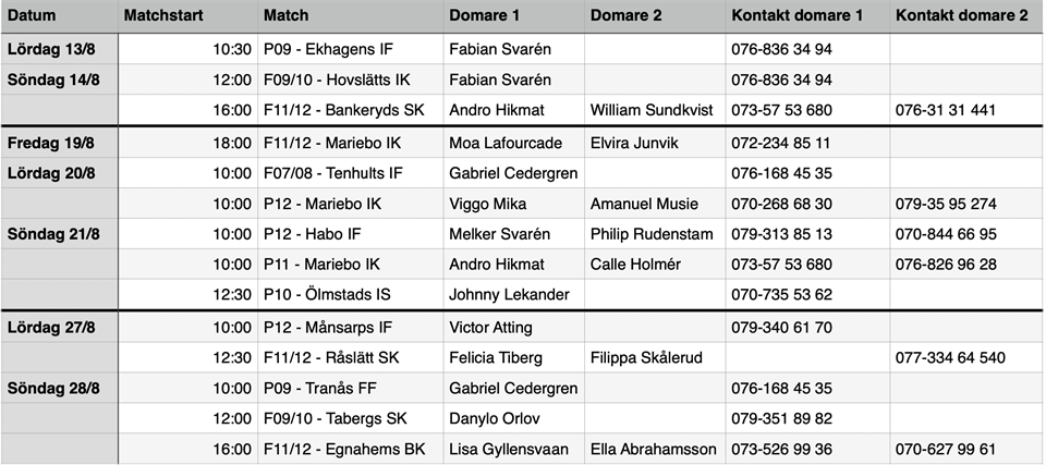 Här kommer domarschemat för augusti. Finns även under dokument. Som vanligt hör ni av er till era domare några dagar innan matchen. Har hört från vissa ledare att matcher har flyttats etc... se till att ni uppdaterar detta i fogis, skulle detta inte ha gjorts måste ni kontakta mej så löser vi domardelen. Vid eventuella fel och klagomål kontaktar ni Albin på 0705556251. Ledare 9 aug 2022 0kommentarer