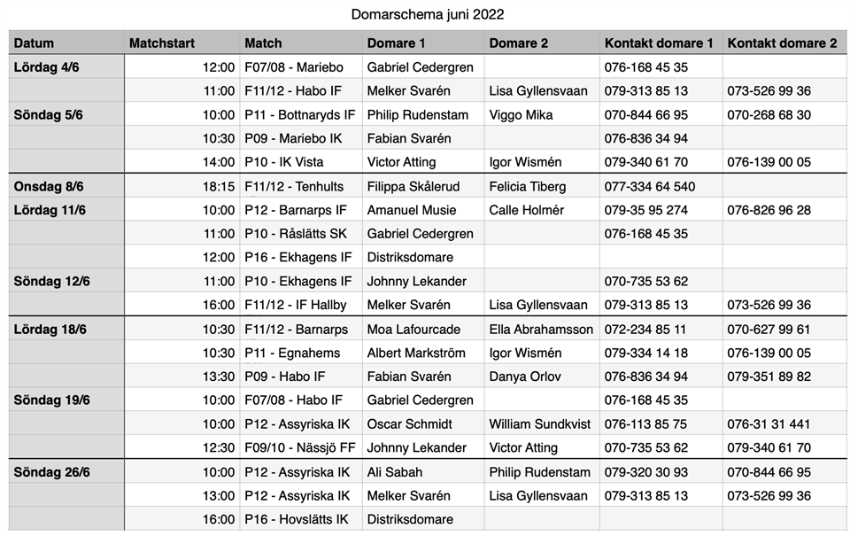 Här kommer domarschemat för juni. Går även att hitta under dokument. Som i vanligt ordning hör ni av er till era domare några dagar innan match. Det är många nya domare som dömer denna månad, så se till att pusha på dom bra. Skulle något i schemat inte stämma hör ni av er till Albin på 0705556251.