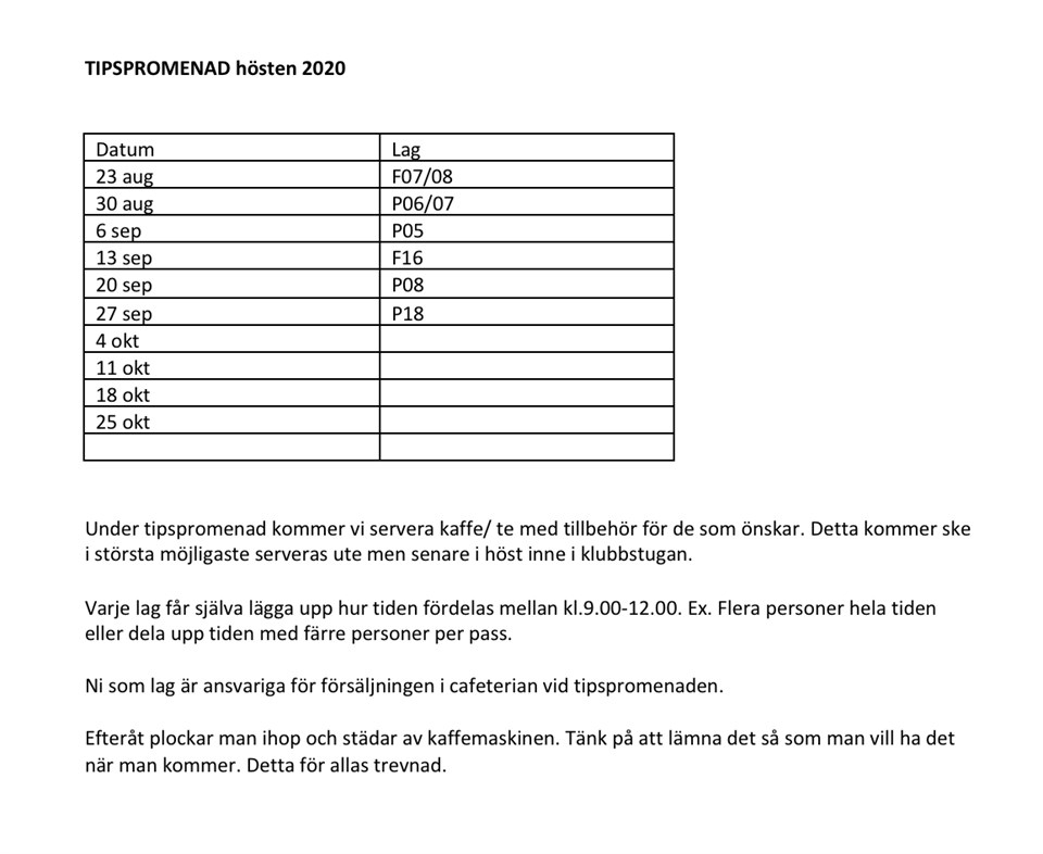 Det är nu bestämt att det inte kommer bli någon servering under herr o dam matcher. Istället kommer de lagen som finns med på listan hjälpa till på höstens tipspromenader. Vi har försökt att byta kioskhelg till tipssöndag. Skulle den söndagen ni har blivit tilldelade inte passa, så försök att byta med annat lag. Schemat läggs på ledarsidan under dokument.