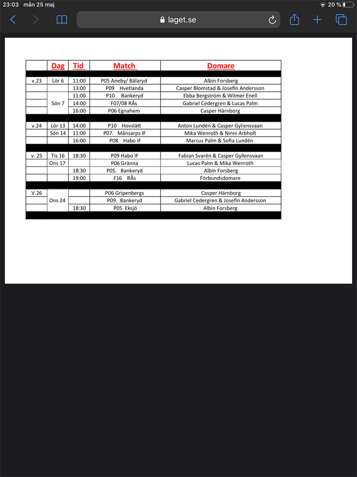 Hej alla domare! Vi ber om ursäkt att inte alla matcher har blivit av och att några utav er har fått matcher inställda. I slutet av säsongen ska vi ha försökt att göra så att ni har dömt ungefär lika många matcher beroende på om ni dömer 11mot11 och 7mot7. När ni inte kan döma någon match så se till att byta med någon, istället för att "ge bort den". Då är det svårt för oss att göra det lika i slutet av säsongen. Det är bättre att ni blåser i pipan för hårt än svagt och var där spelet är så blir ni mer aktiva på planen. ⚽⚽⚽⚽⚽⚽⚽⚽⚽⚽ Ledarna tycker att ni gör ett bra jobb och de är tacksamma att ni hjälper till.
