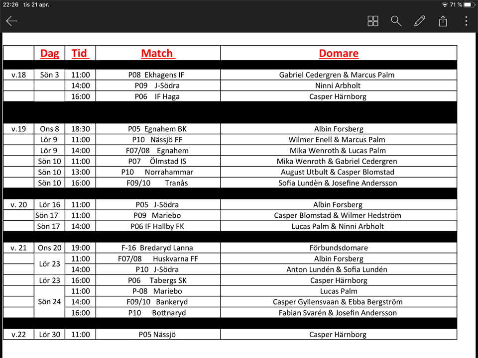 Hej alla domare! Under dokument på denna sida finns nu ett domarschema för maj månad. Någon utav ledarna från laget ni ska döma, ska höra av sig till er och berätta om matchen blir av eller inte, speciellt nu under covid-19. Skulle det vara så att ni inte kan döma så måste ni byta med någon annan i god tid.. Telefon nummer till övriga domare finns under fliken laget på denna sida. När ni har dömt er match så ska ni hänga upp domarkläderna på galge i garderoben i "domarrummet". Har det regnat så häng tröjan/ byxorna på en galge och sedan på en krok vid väggen. Det kommer komma en visselpipa till er var som ni har ansvar över att ta med till matchen. Detta för att inte blanda bacillerna. Håller tummarna att de ska komma innan nästa helg.