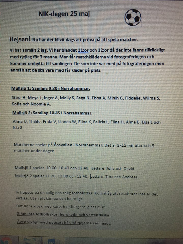 Hej På torsdag är det fotografering för hela laget. Vi kommer ta ett lagfoto och sedan kommer det finnas möjlighet att ta individuella foton. Lappar med information om kostnader för detta delades ut på förra träningen. Om ni inte var med eller har tappat bort lappen så kan man få en ny på plats på torsdag. Fotograferingen startar kl 17 och då måste vi vara ombytta och klara så vi samlas kl 16:40 så att vi hinner byta om innan. Mvh Ledarna. P2012 21 maj 2019 1kommentar
