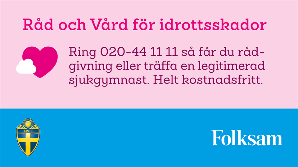 För en knapp månad sedan släpptes "Råd och vård för idrottsskador", en helt ny tjänst från SvFF där fotbollsspelare vid skada snabbt får gratis konsultation och expertisvård. Det är inte bara vid skada som du kan ringa utan även för att få råd kring skadeförebyggande åtgärder. Råd och Vård för idrottsskador är en kostnadsfri rådgivningstjänst och din medlemsförmån. Ett nätverk av erfarna idrotts-sjukgymnaster och läkare runt om i landet står beredda att hjälpa våra spelare. Och det är helt kostnadsfritt. Så här går man till väga: 1. Spelare/ledare/förälder ringer "Råd och vård för idrottsskador" - 020 44 11 11 2. En sjukgymnast svarar i telefonen och ger råd för den aktuella situationen. 3. Om sjukgymnasten bedömer att spelaren behöver få träffa en vårdgivare kan denne boka en tid till spelaren direkt i telefonen. 4. Spelaren besöker sjukgymnast eller läkare. Det är också möjligt att få ett återbesök hos sin sjukgymnast eller en röntgen hos sin läkare. (Det finns dock en begränsning på max två sjukgymnastbesök, ett läkarbesök, en röntgen.) Om olyckan är framme är det första omhändertagandet viktigt. Genom den försäkring i Folksam som alla registrerade fotbollsspelare åtnjuter har ni nu tillgång till Råd och vård för idrottsskador. Mer information hittar du på denna sida Råd och Vård SvFF Informera alla föräldrar i ert lag om denna tjänst för att på bästa möjliga sätt hjälpa till vid skador. //Emil Fritzell