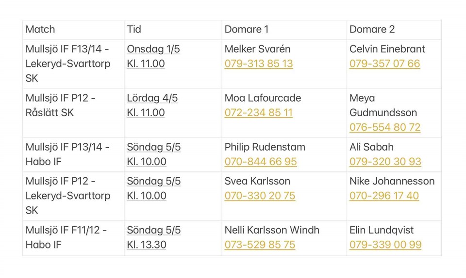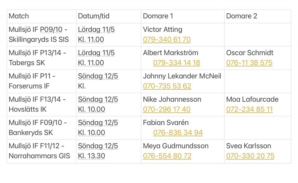 Domarschemat v.19 Hör av er till domaren någon dag innan match. Har ni frågor eller andra funderingar om schemat så hör av er till Johanna 0723758587
