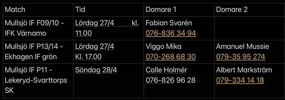 Här kommer domarschema för april. P11’s match på söndag är inte tidlagd än, mer info kommer så snart som möjligt.