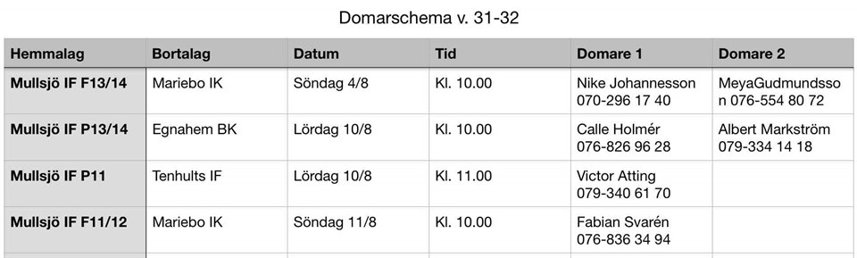 Hej! Hoppas att ni har haft en skön sommar! Här kommer domarschemat för v. 31-32 Kan ni inte döma matchen ni är tilldelad har ni eget ansvar att byta med varandra. Har ni frågor eller andra funderingar om schemat så hör av er till Johanna 0723758587 Domare 28 jul 2024 0kommentarer