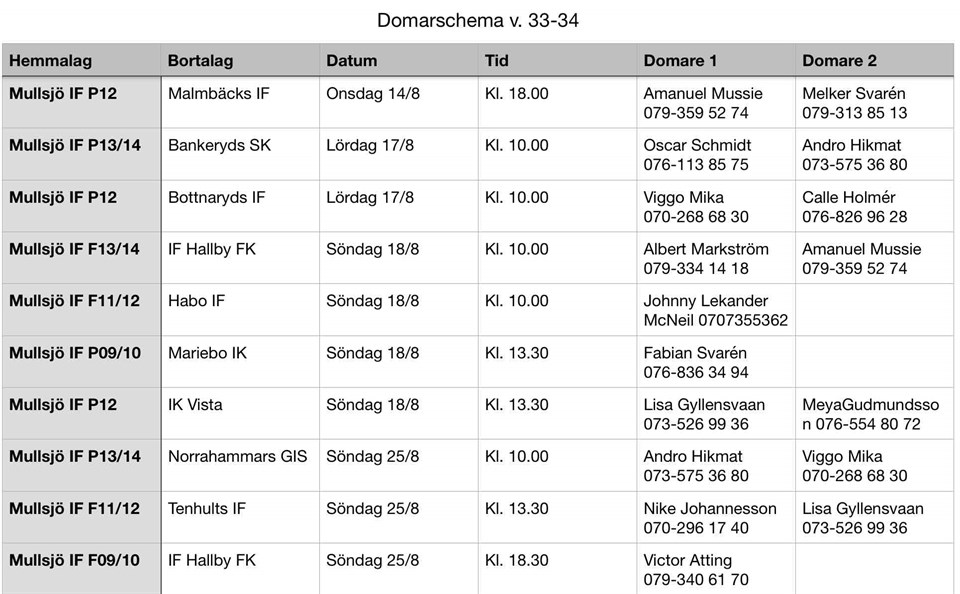 Här är även domarschemat för v. 33-34 Kan ni inte döma matchen ni är tilldelad har ni eget ansvar att byta med varandra. Har ni frågor eller andra funderingar om schemat så hör av er till Johanna 0723758587 Domare 28 jul 2024 0kommentarer