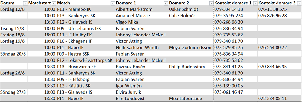 Här kommer schemat för augusti månad... Det gamla vanliga gäller fortfarande.. ni ska höra av er till er domare några dagar innan matchen.. Hittar ni något fel i schemat hör ni av er till Albin på 0705556251. Ni hittar även schemat under `dokument/domarschema 2023`. Har ni frågor, funderingar eller klagomål angående dömmeriet hör ni bara av er! :) Ledare 10 aug 2023 0kommentarer