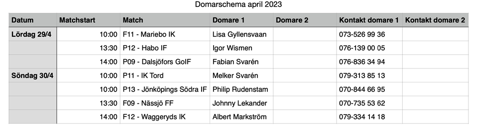 Här kommer domarschemat för april månad. I vanlig ordning tar ni kontakt med era domare några dagar innan matchen och checkar av så allt står rätt till. Skulle någon i schemat vara galet är det bara att höra av er till mej på 0705556251. Observera att vi ledare inte betalar ut arvodet tilll domarna längre, utgår ifrån att detta togs upp på upptaktsträffen...? Info om domarutbildning kommer inom kort...